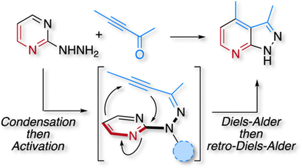 Activating pyrimidines by pre-distortion for the general synthesis of 7-aza-indazoles from 2-hydrazonylpyrimidines via intramolecular Diels-Alder reactions. Le Fouler, V.; Chen, Y.; Gandon, V.; Bizet, V.; Salomé, C.; Fessard, T.; Liu, F.; Houk, K. N.; Blanchard, N. J. Am. Chem. Soc.2019, 141, 15901-15909.