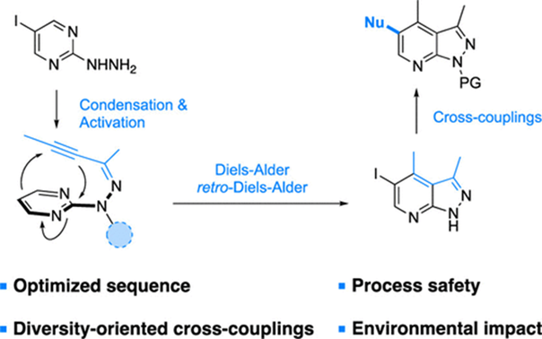 Optimized synthesis of 7-aza-indazole by Diels-Alder cascade and associated process safety. Brach, N.; Le Fouler, V.; Bizet, V.; Lanz, M.; Hoehn, P.; Gallou, F.; Bailly, C.; Parmentier, M.; Blanchard, N. Org. Proc. Res. Dev. 2020, 24, 776-786.