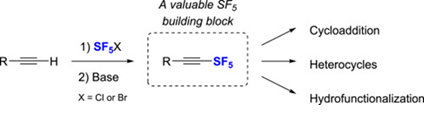 Synthesis and further use of SF5-alkynes as platforms for the design of more complex SF5-containing products. Popek, L.; Nguyen, T. M.; Blanchard, N.; Cahard, D.; Bizet, V. Tetrahedron 2022, 117-118, 132814.
