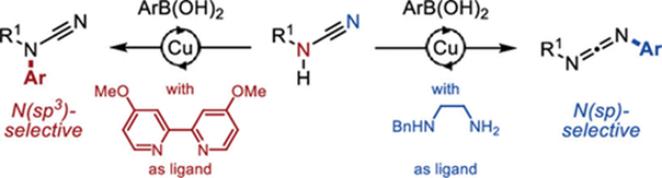 Copper-Catalyzed, Ligand-Controlled N(sp3)- or N(sp)-Selective Arylation of Cyanamides. Fang, J.; Bekkouch, O.; Zeiser, G.; Zubchuk, Y.; Bizet, V.; Blanchard, N.; Evano, G. Org. Lett.2023, 25, 6446-6451.