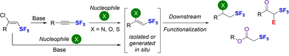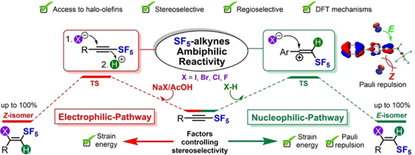 Ambiphilic Reactivity of SF5-Alkynes Applied to Regioselective and Stereodivergent Halogenation Reactions: An Experimental and Theoretical Case Study. Matchavariani, D.; Popek, L.; Cabrera-Trujillo, J. J.; Nguyen, T. M.; Blanchard, N.; Miqueu, K.; Cahard, D.; Bizet, V. Adv. Synth. Catal. 2024, 366, 3481-3493.