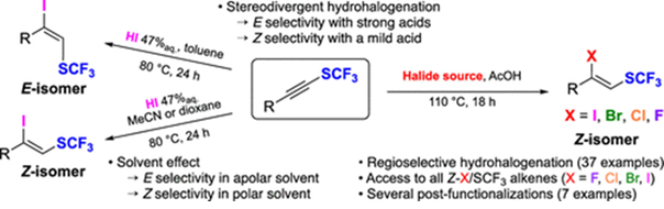 Stereodivergent Hydrohalogenation of SCF3 Alkynes and Cross- Coupling Reactions. Marie, N.; Uyen Ly, K.; Shibata, N.; Bizet, V.; Cahard D. Org. Lett.2024, 26, 9168–9172.